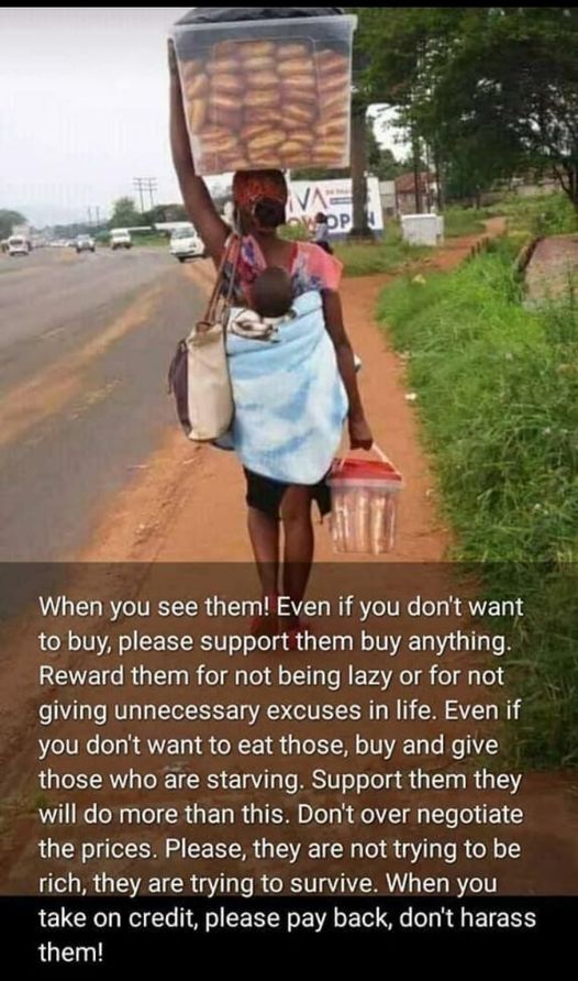 Those single mothers out there. When you see them hawking food on the street. Please buy from them, let them keep the change They are not trying to be rich. They are only trying to Survive!